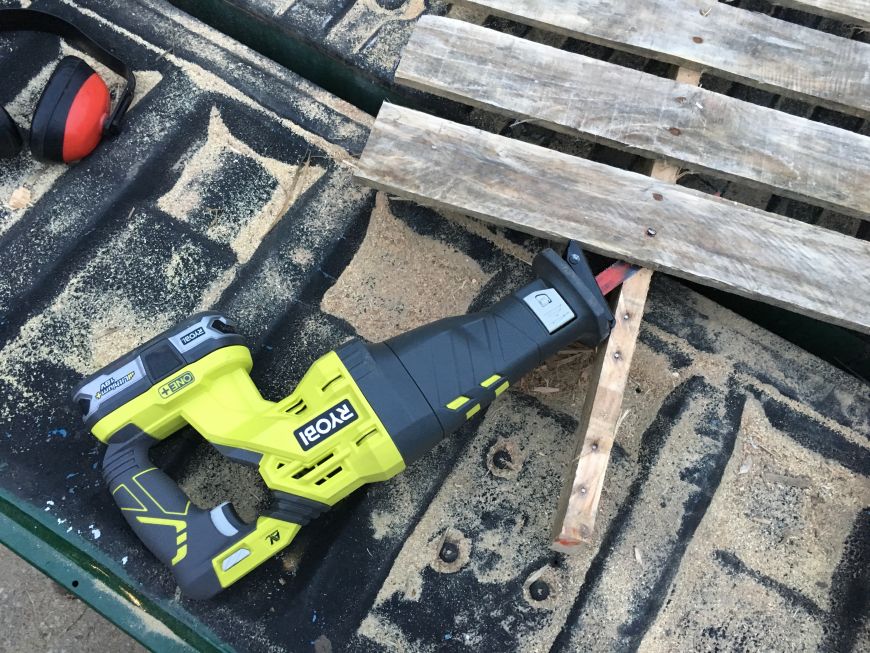Next, I used a recipricating saw to cut through the nail for all the nails in the middle. This left the nail head in the wood but it didn't matter to me. I also needed to use a demolision blade that can cut through both metal and wood. The diablo blade I used cut through all 7 pallets and is still sharp!