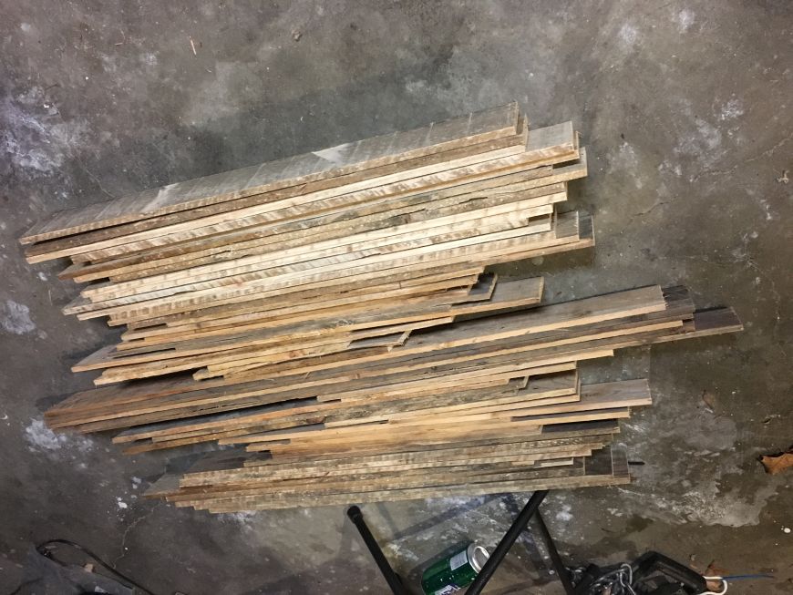 Next, I gathered up all the wood and started sorting them. I needed board with at least one good edge, which would be the top of the table. If any boards didn't have one good edge, then I through it out. Next, I trimmed the ends with a chop saw to square them up, and I also cut them into random sizes so there would be a good random staggered pattern in the table top. I also used a belt sander to remove any high spots and to clean up the top edge.