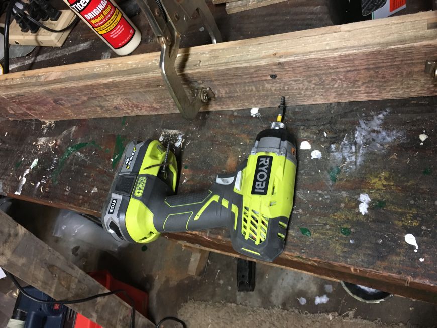 Once the whole block was screwed together, I had to carve out a flat spot on the bottom (facing up at this point) for the legs. I used a flush cutting multi-tool (Ryobi Job-Plus) to cut releave cuts, and a sharp chissel to remove the material.