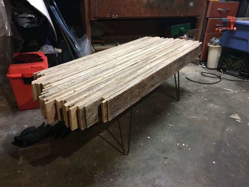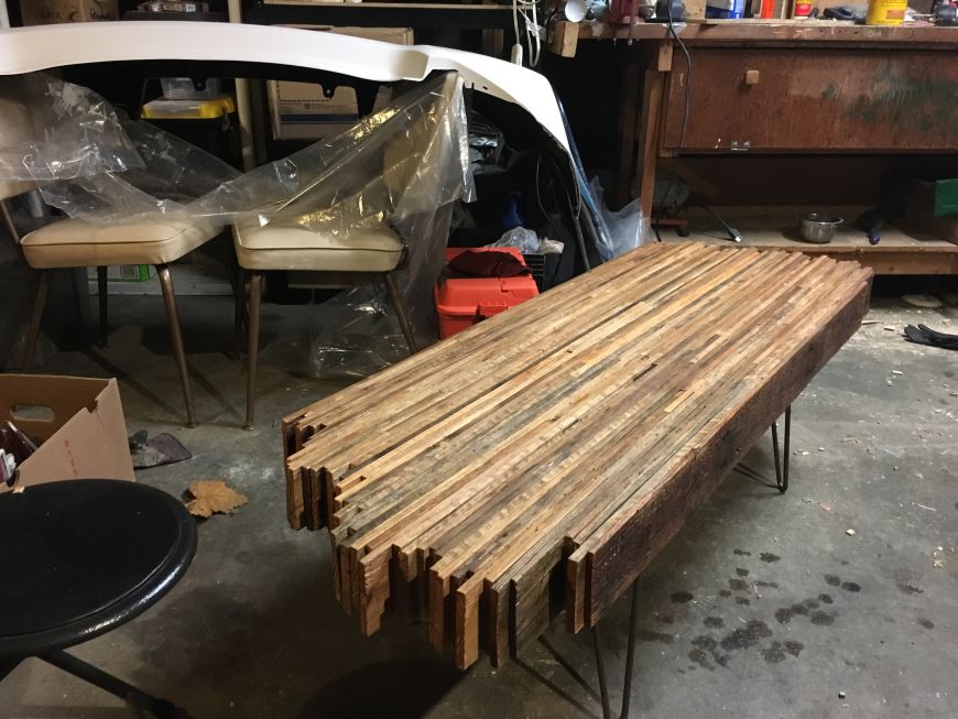 Screwed on the lets (from www.hairpinlegs.com), flipped it over, and viala! At this point I could have used my belt sander, or a hand planner, to get a perfectly smooth top, but there were so many imperfections in the wood that it wouldn't have ever been perfectly smooth and flat.