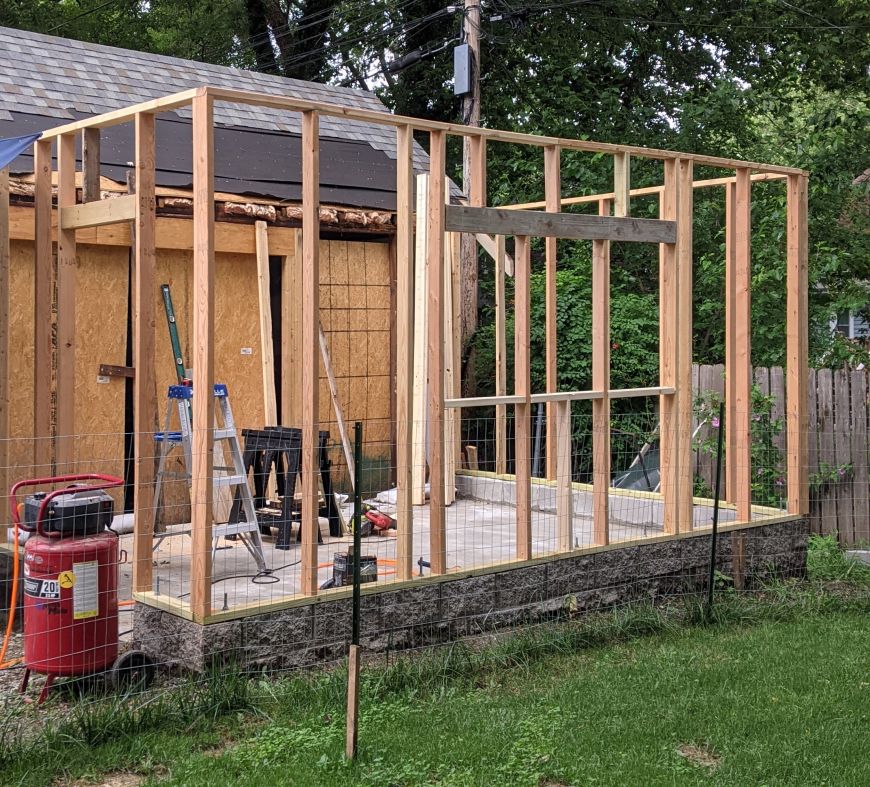 Before I could build and raise the walls, I had to remove some of the garage's roof: