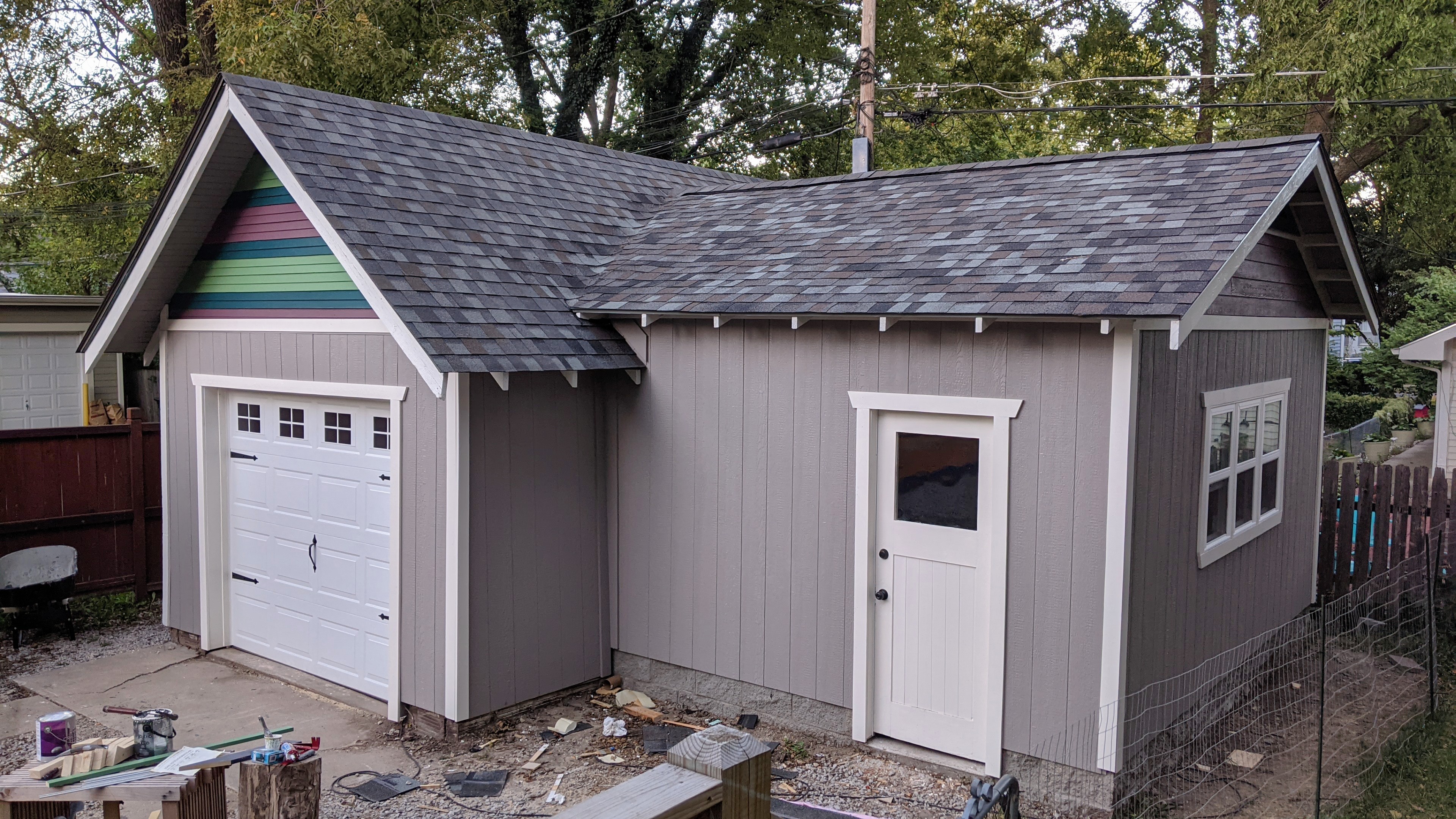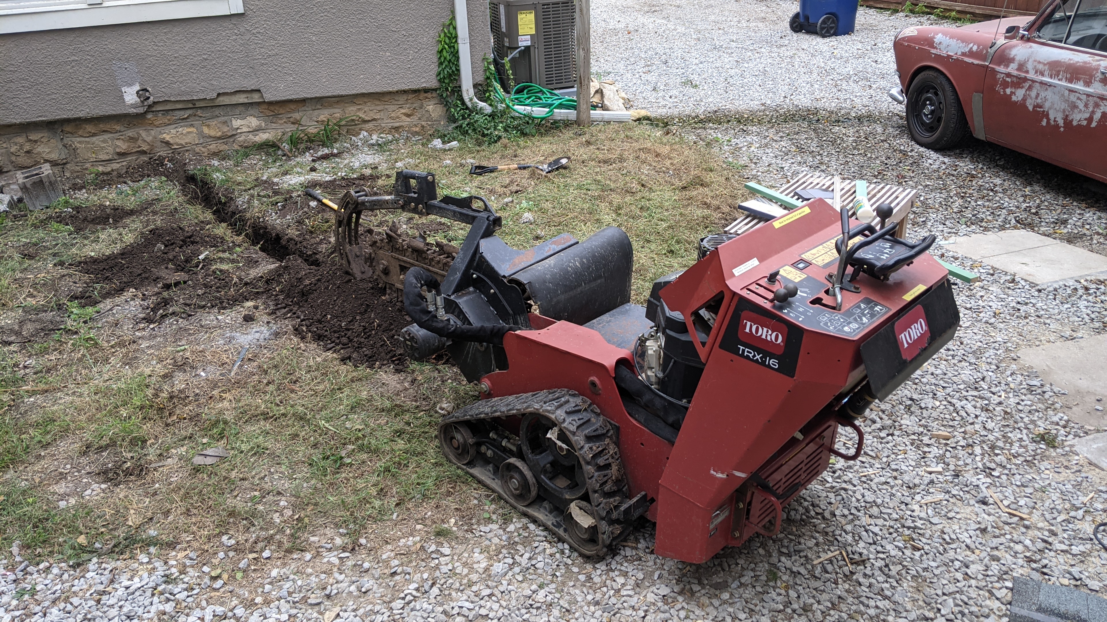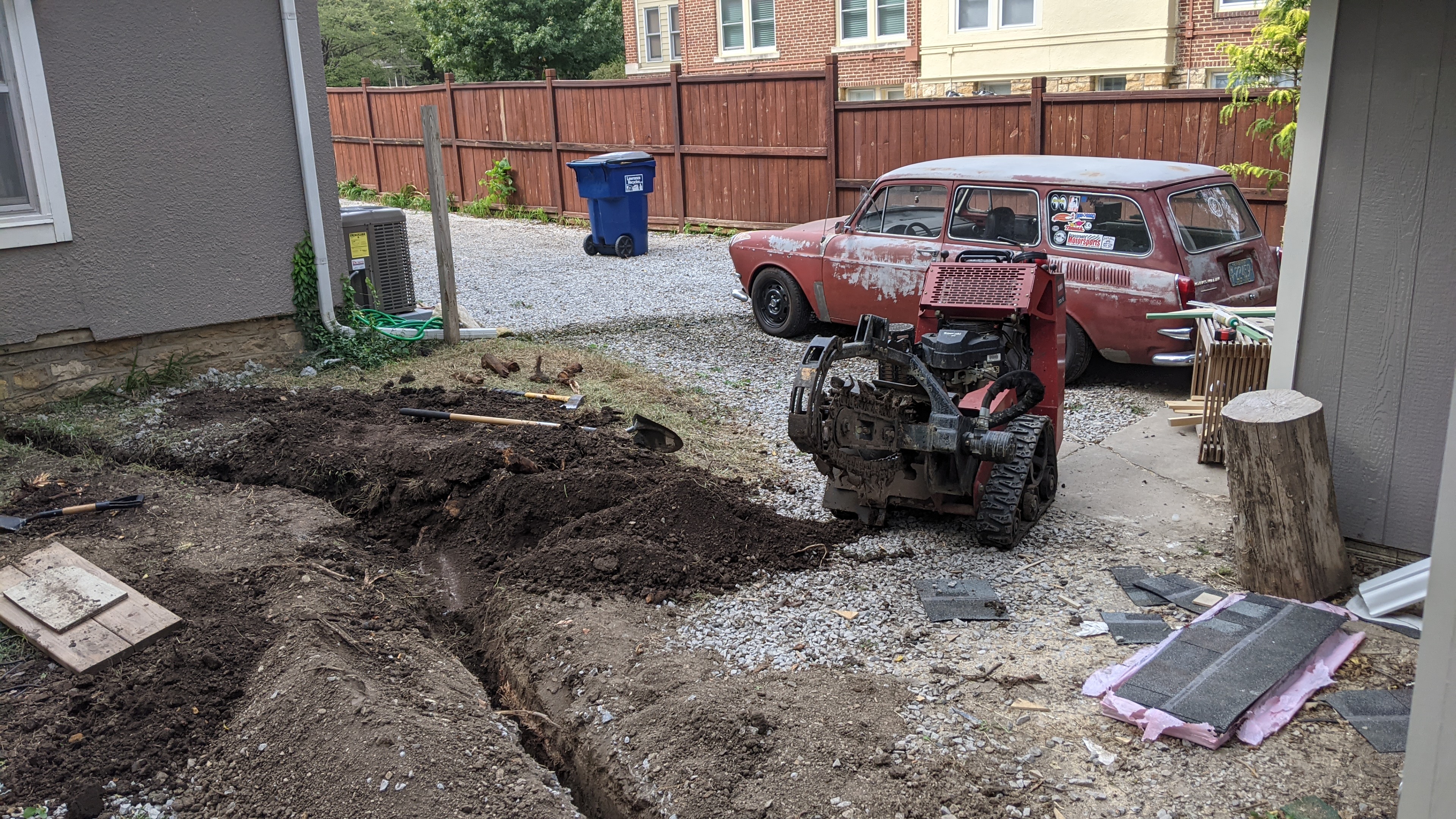 Speaking of mess, I had to dig a trench for the underground electrical service to the garage. 100 amps, 240 volts via 2-2-2-4 aluminum wire.