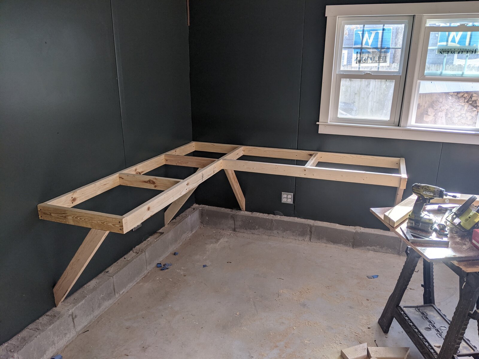 I decided to smash apart the old workbench, use the salvaged lumber for shelf, and build an all new workbench.