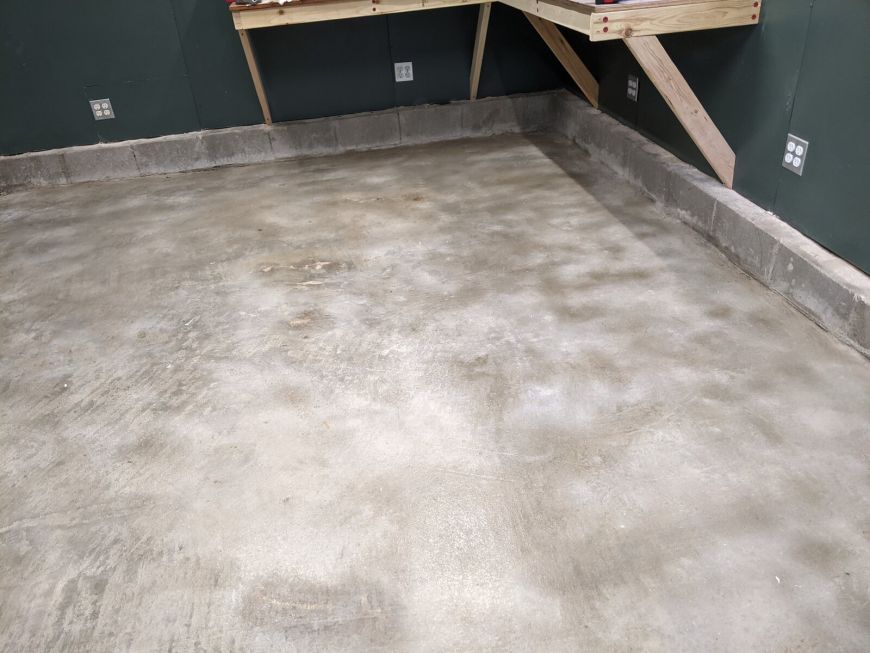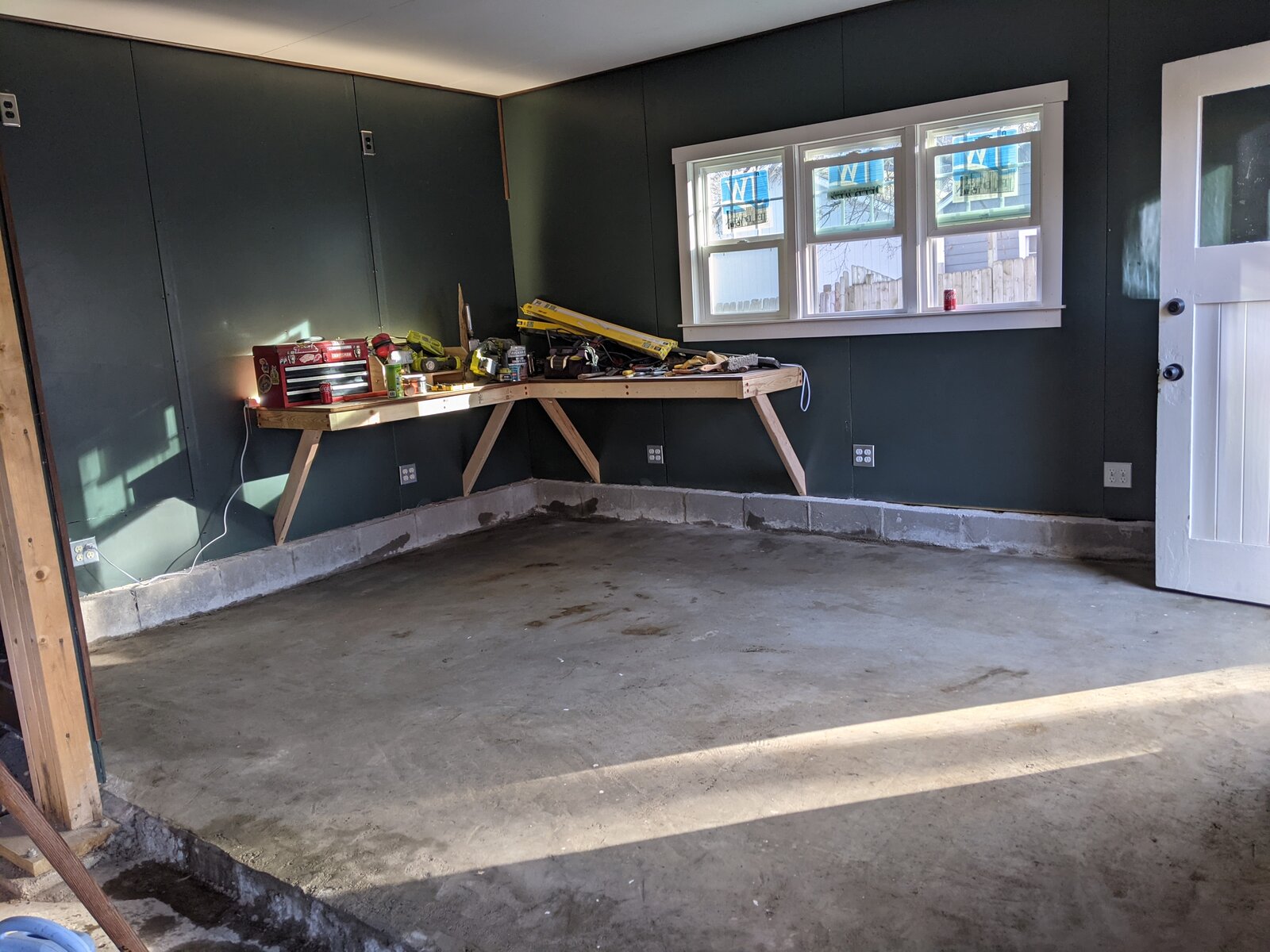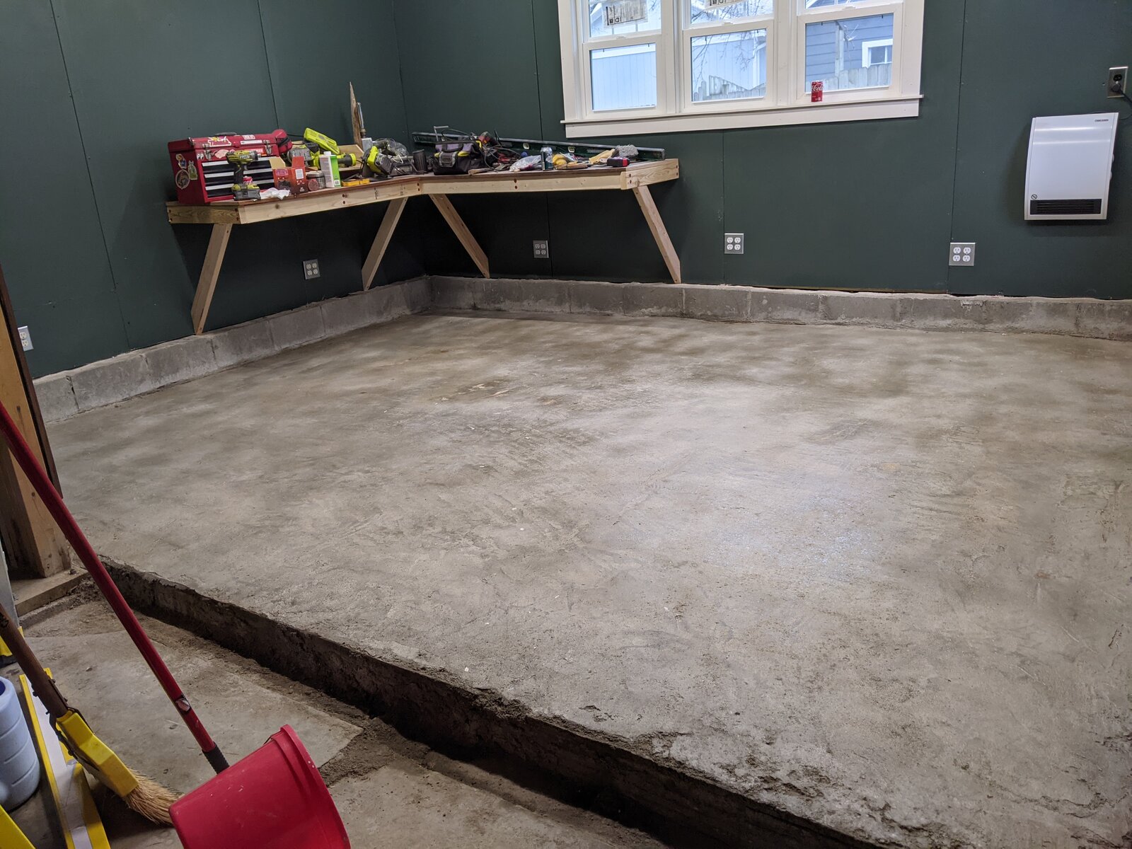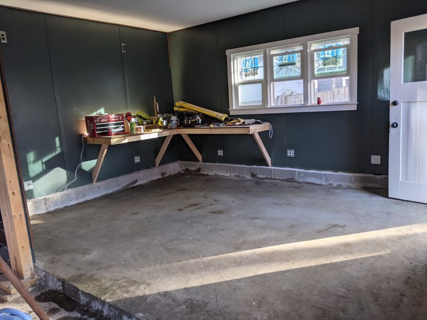 The was a reason why I built the workbench before sealing the concrete floor: so that I could put everything that was on the floor onto the workbench instead! Now the floor was finally clear and free for the first time since the concrete was poured. I washed it with muriatic acid and then let it dry overnight.