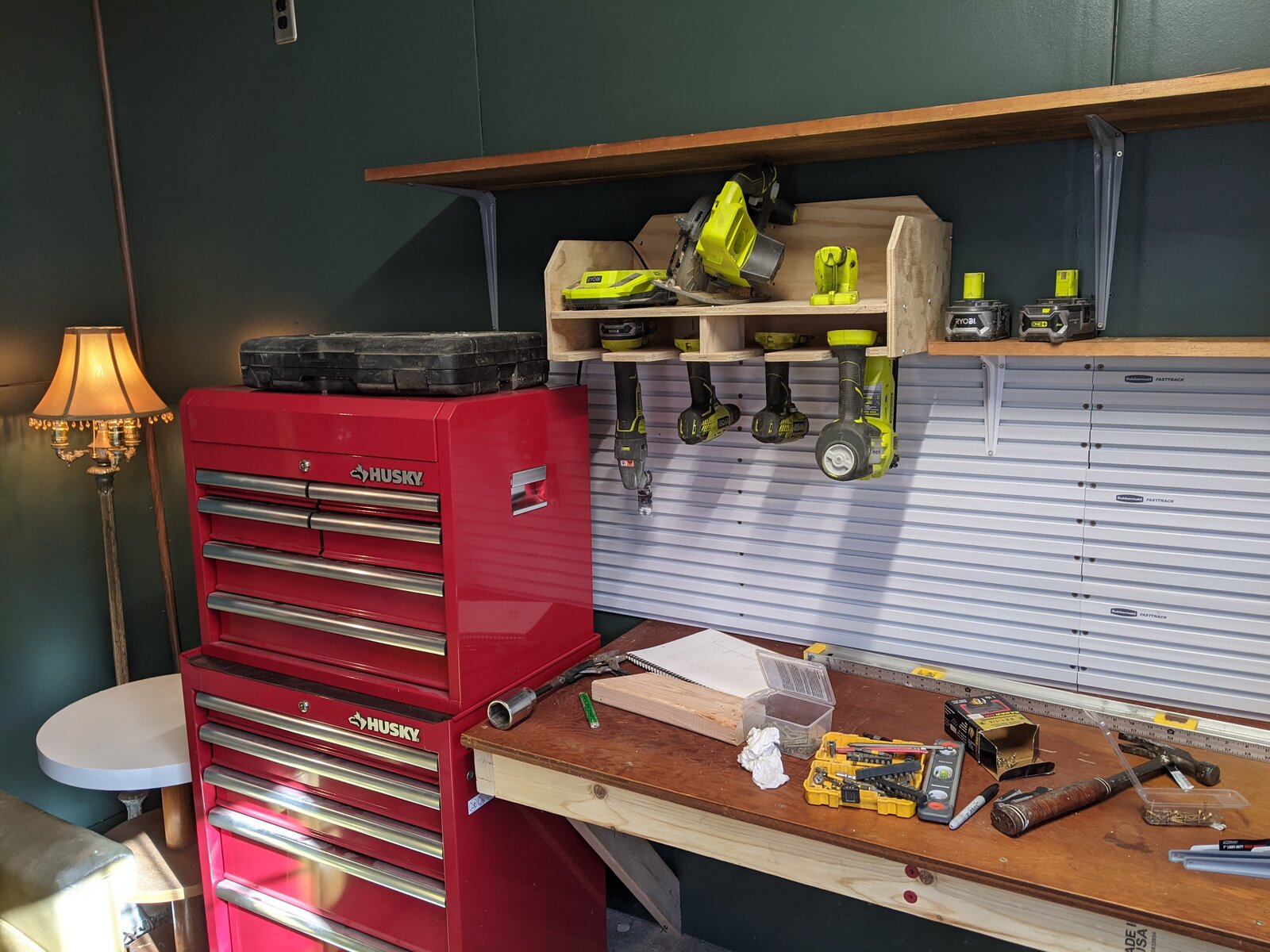 Then I started hanging the shelves, a power tool holder I built a few years ago, and this french cleat system from Rubbermaid (pricy but I'm very happy with it).
