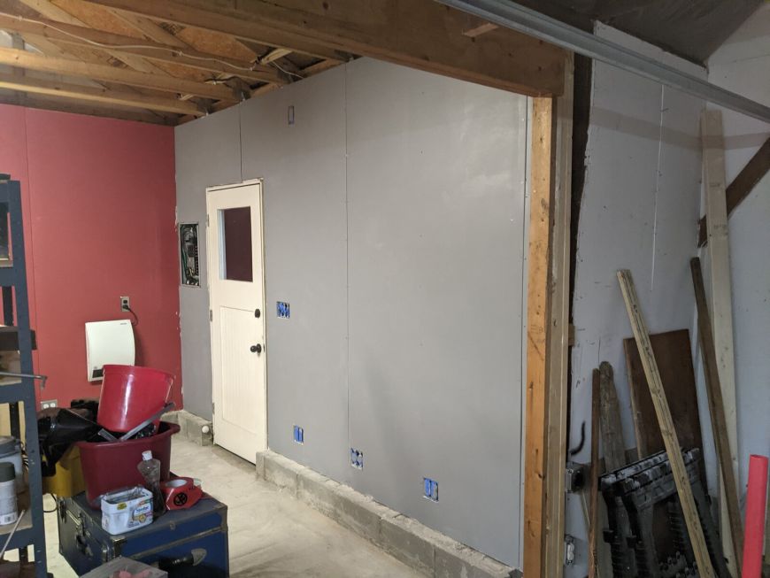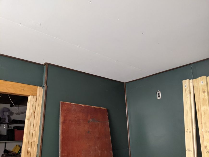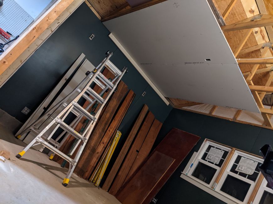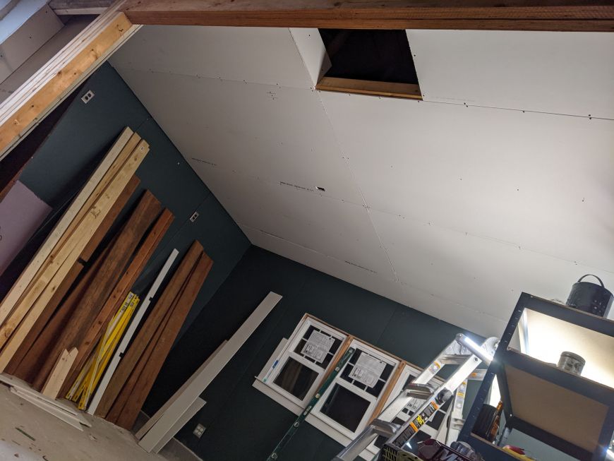 Time for ceiling drywall! I did it ALL BY MYSELF! You see the horizontal 2x4 on the wall that held up one end of 4' x 8' drywall sheet while I held up the other with one hand and screwed it it with the other hand.