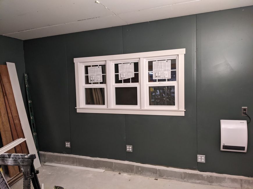 I didn't bother with mudding the drywall joints, so I put some vinyl-wrapped trim in/on all the corners.