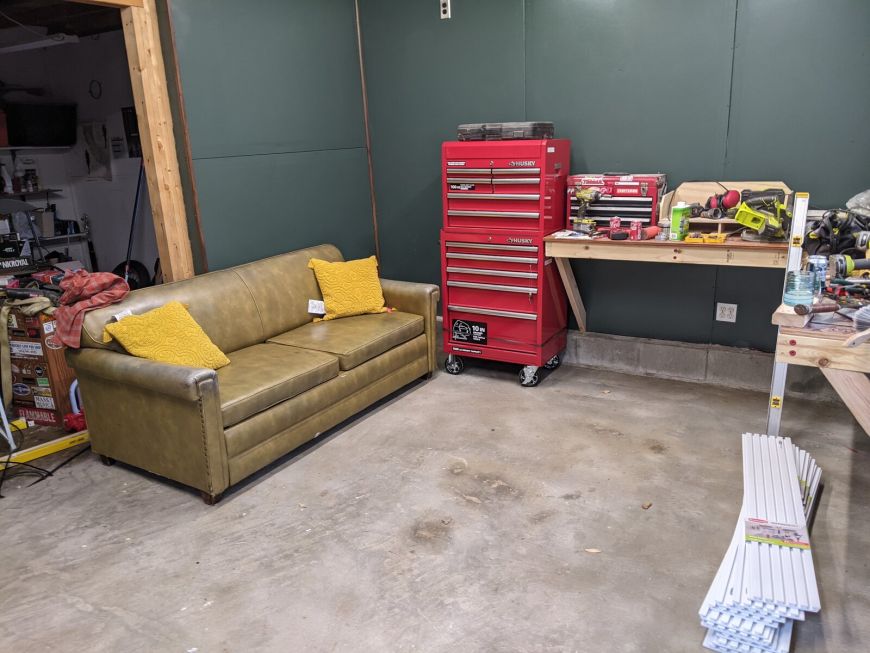 I bought a new tool box from HD and brought in this perfect couch I got from a friend for free. Yeah thats right baby, this workshop has a couch!
