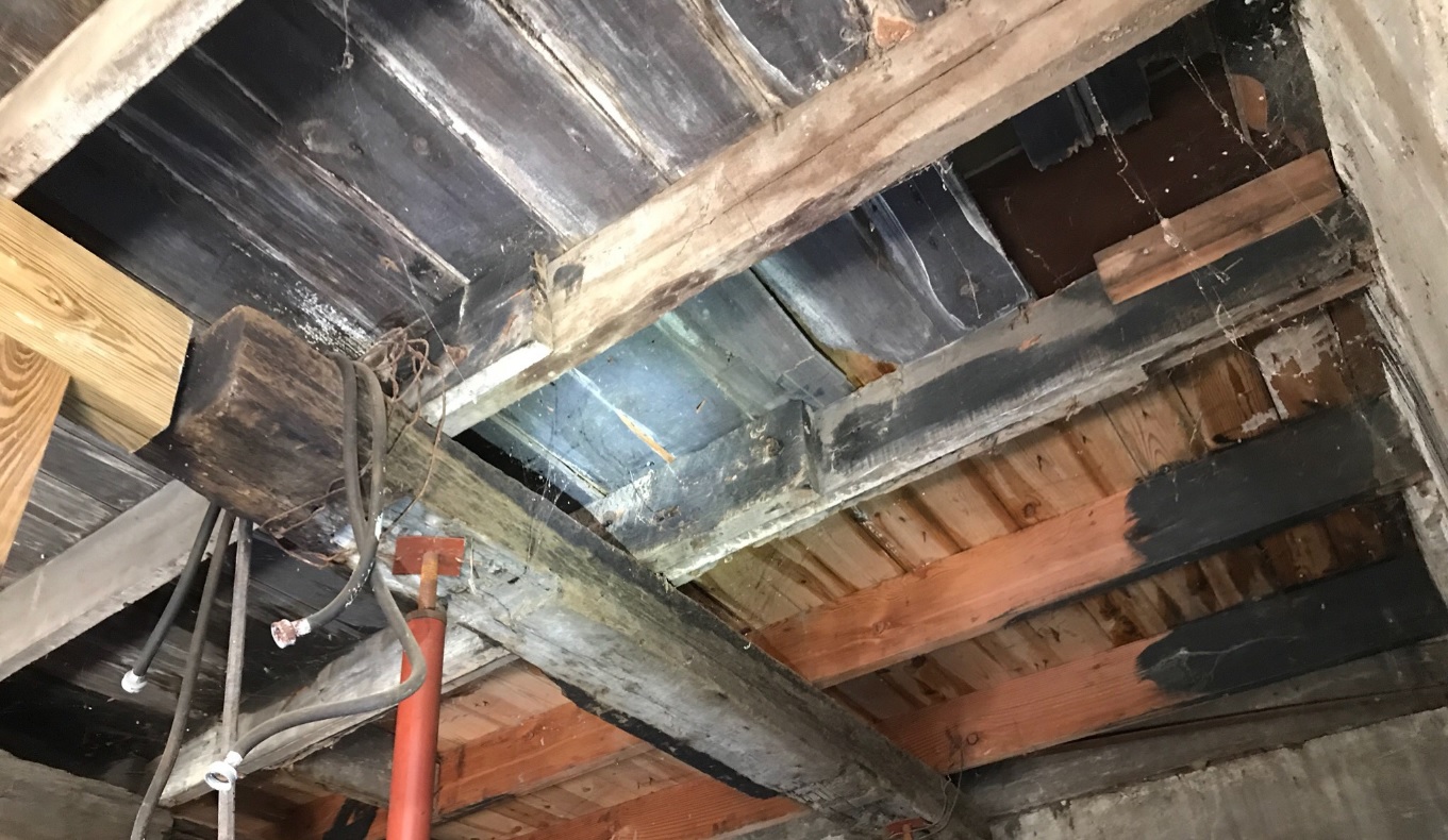 Going down into the basement with a flashlight you can see some pretty obvious termite damage, and that there's been repairs in the past.