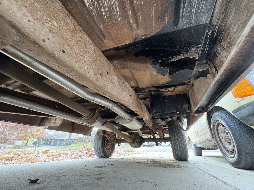 The truck bed was treated and rust-proofed with POR-15, and then top-coated with Rustoleum tractor paint (red oxide color). I also applied more POR-15 to anything under the truck that was getting a bit rusty. In other words, I made sure rust would not grow and become a problem. Even if some metal is still missing, like from the cab supports under the truck. Check out the photos bellow to see what I mean.