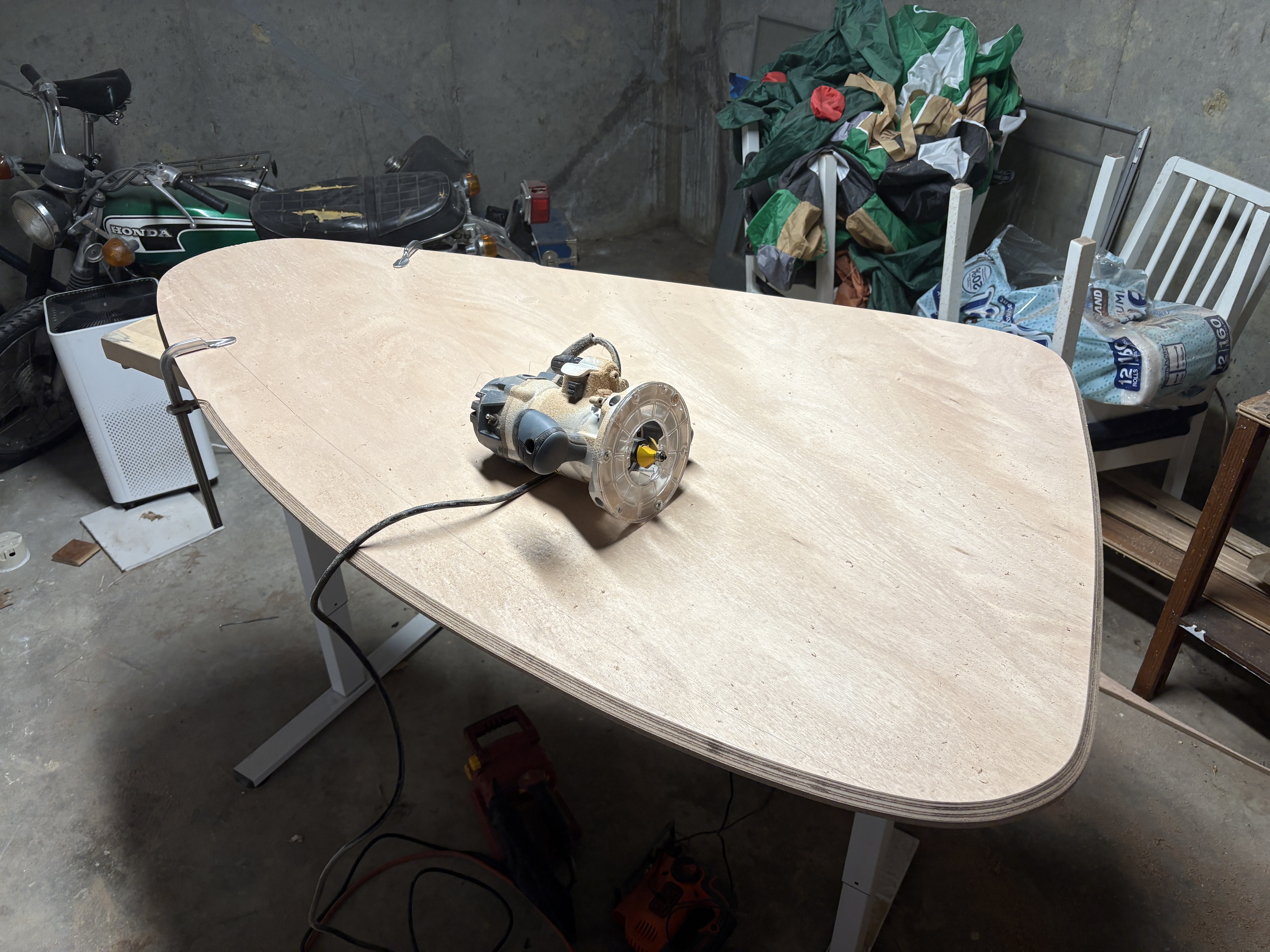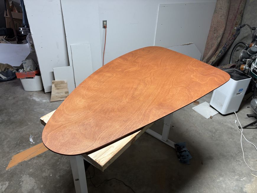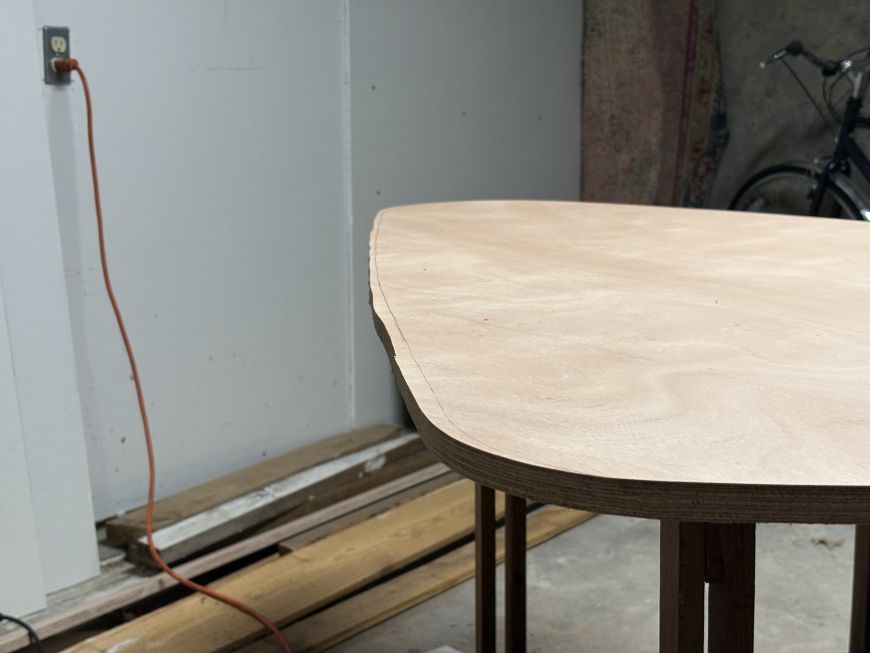 The plan was to get some plywood, cut it out with a jigsaw, and then use a tulip style base. Very easy. However I made a bit of a mistake at the hardware store. I assumed that the most expensive plywood they had ($130), made from most exotic sounding species I've ever hard of (African Okoume), would be a hardwood. Well it turns out that it's actually very soft, softer than hemlock. I was hoping to finish it with Rubio Monocoat for its superior protection from scratches and water damage, but it would have dented and gauged too easily, so I'll have to use polyurethan instead.